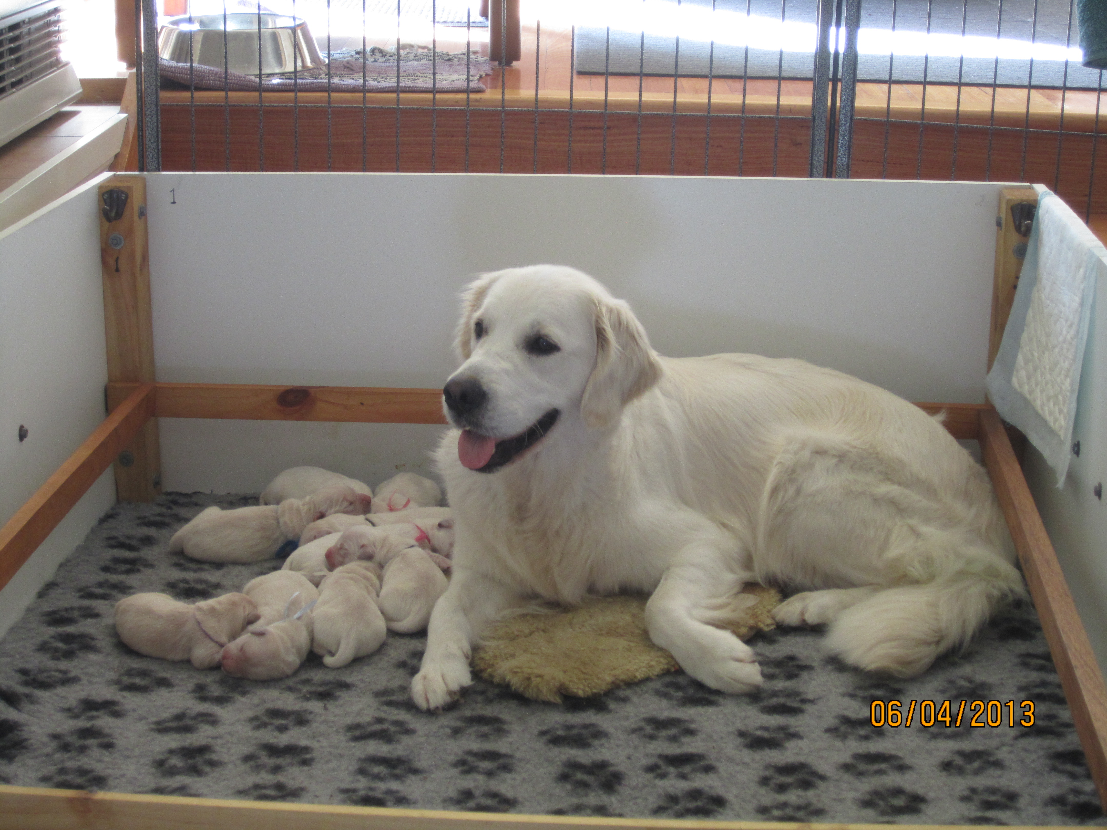 The puppies spend the first five weeks in the whelping box in our kitchen and family room. We enlarge this area to fill the space so puppies can become desensitised to household noises such as vacuum cleaners, television, radio and front door bells. They then live outside in the puppy "Hilton" until they go to their new families. View "Our Puppies" on the website to see photos of these two areas.